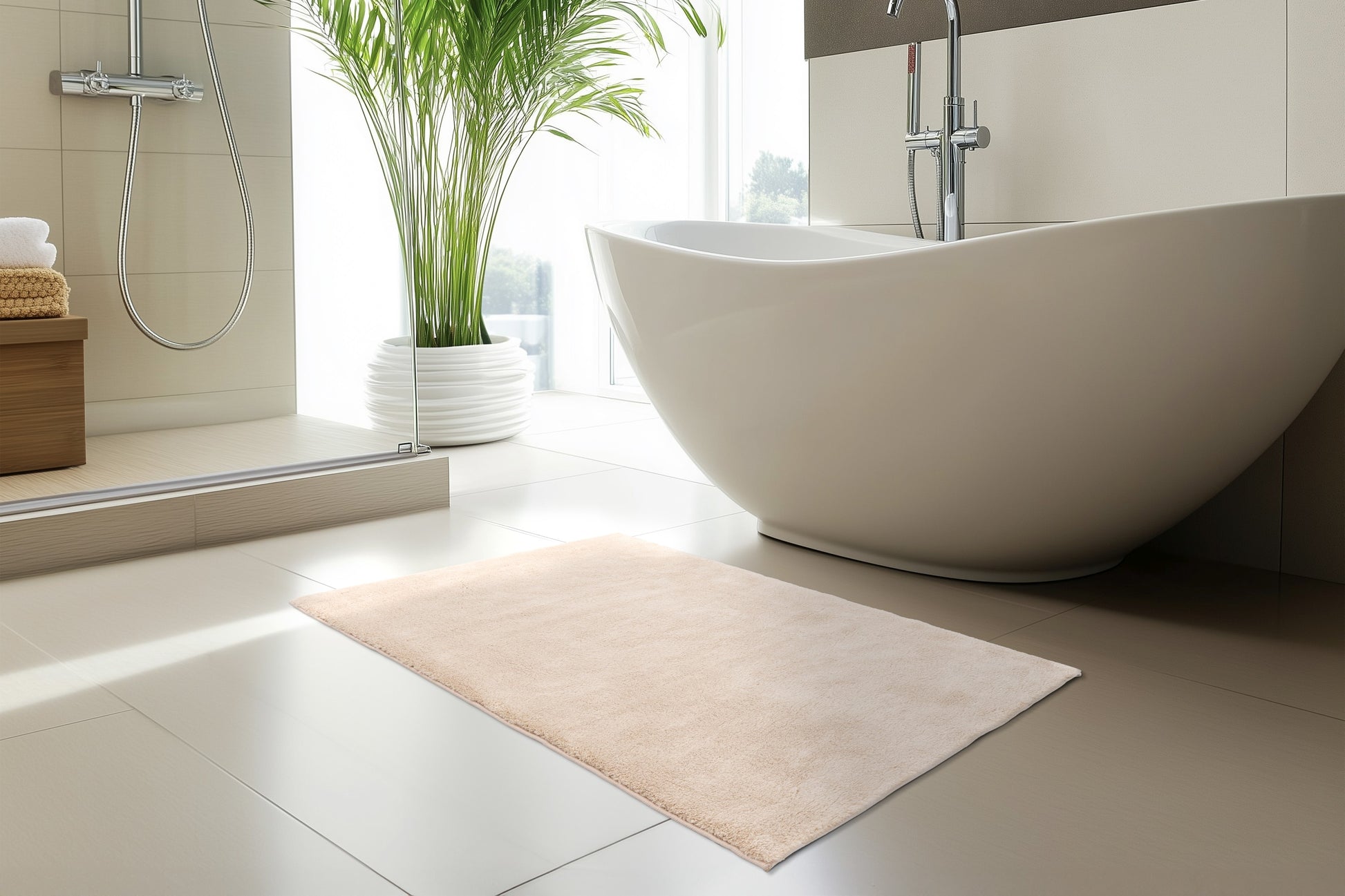 Badematte Aqua Bliss 125 – eine weiche Polyester-Badematte mit 16 mm Florhöhe und 1700 g/m². Ideal für Badezimmer. Das warme Beige passt zu jedem Interieur. Erhältlich in drei Größen. Rutschfest, saugfähig und pflegeleicht. Vorteile: antibakteriell, formstabil, schnelltrocknend. Jetzt bestellen und Ihr Badezimmer mit Wärme ausstatten!