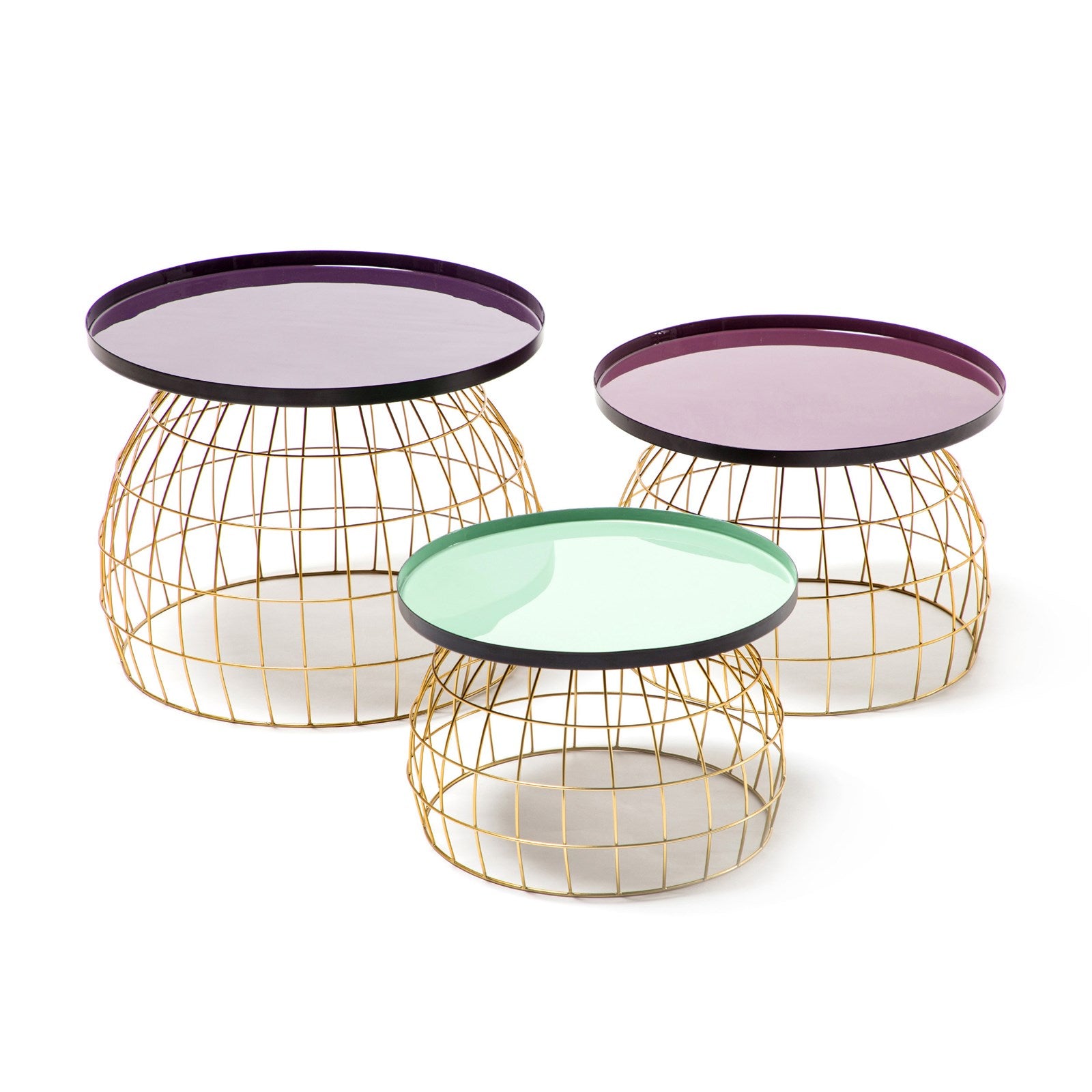 Dieses Tisch-Set überzeugt durch die offene, korbartige Gestellform sowie die glatten, runden Tischplatten. Die drei unterschiedlich großen Tische mit verschieden eingefärbten unifarbenen Tischplatten lassen sich als Set harmonisch drapieren und sorgen für ein elegantes und stimmungsvolles Ambiente im Raum. Natürlich können die Tische auch als einzelne Beistelltische oder Dekotische verwendet und separat platziert werden.